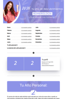 Tu tema numerológico tiene entre 10 y 15 páginas según tu perfil. Es un documento detallado, rico en información y consejos prácticos, que podrás consultar a lo largo de todo el año.